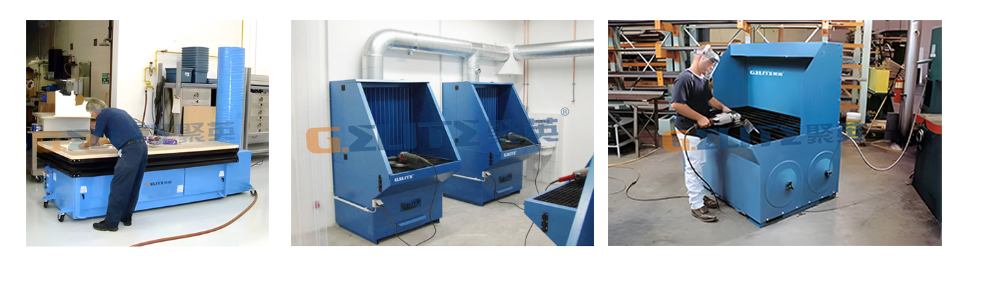 針對(duì)于小工件人工(打磨/拋光)產(chǎn)生煙、粉塵,具有風(fēng)量小,濃度低等特點(diǎn),使用自?xún)羰酱蚰ヅ_(tái)、抽吸收打磨臺(tái)粉塵收集治理。